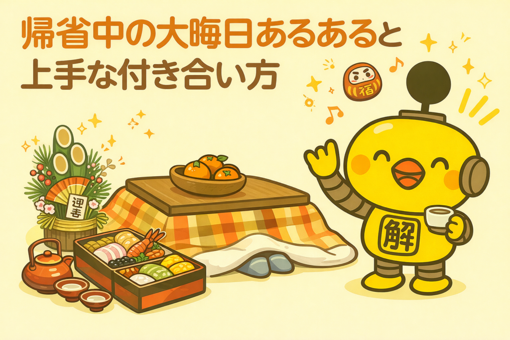 帰省って"エネルギーの大移動"ピヨ〜😵💦 でも、心と時間の使い方ひとつで、家族との時間は宝物になるピヨ!✨ 自己ケア・事前準備・境界線・会話の切り替え――この4つの技術で、大晦日は穏やかに過ごせるピヨ〜!🎊
