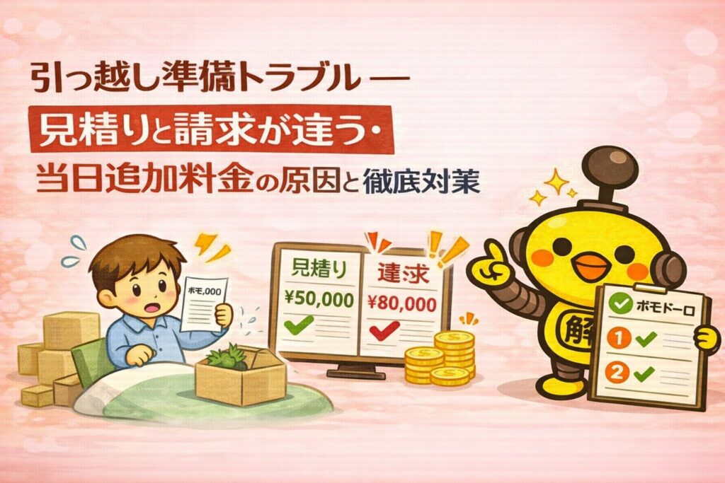 引っ越しってワクワクするピヨね〜🚚💨 でも見積もりと最終請求が違ってビックリ…って話、よく聞くピヨ😱 この記事では原因から防止のコツ、実際に追加料金が出たときの対処法まで丁寧に解説するピヨ〜✨