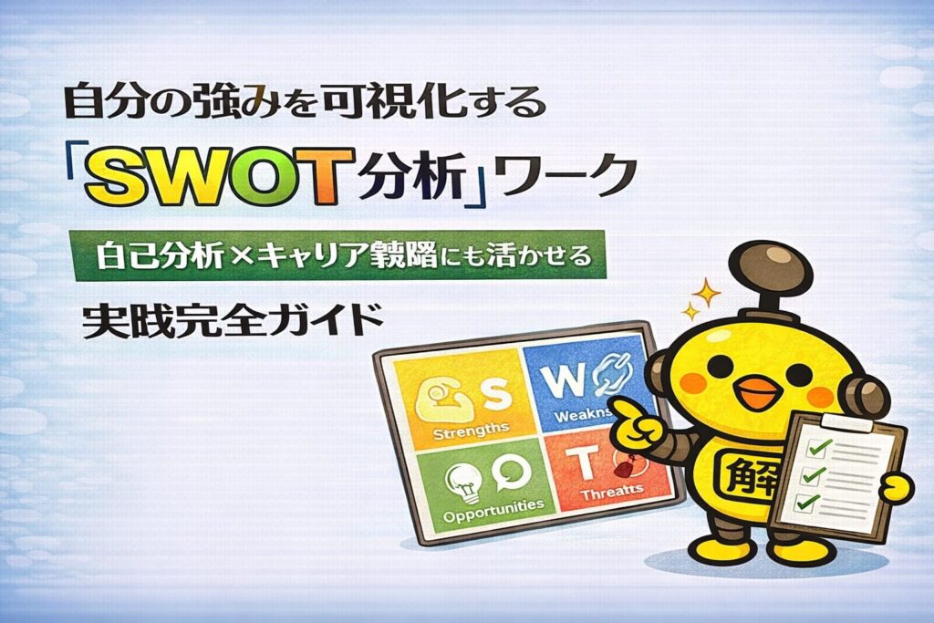 SWOT分析は"自分を知る鏡"ピヨ! 強みだけじゃなく、弱み・環境も整理して戦略にすることで、自信あるキャリア計画が立てられるピヨ〜✨ 大事なのは書くだけじゃなくて、行動に落とし込むことピヨ〜💪